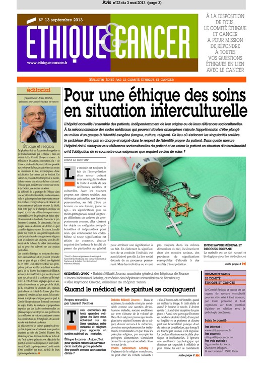 P.1 : Tribune : Pour une éthique des soins en situation interculturelle